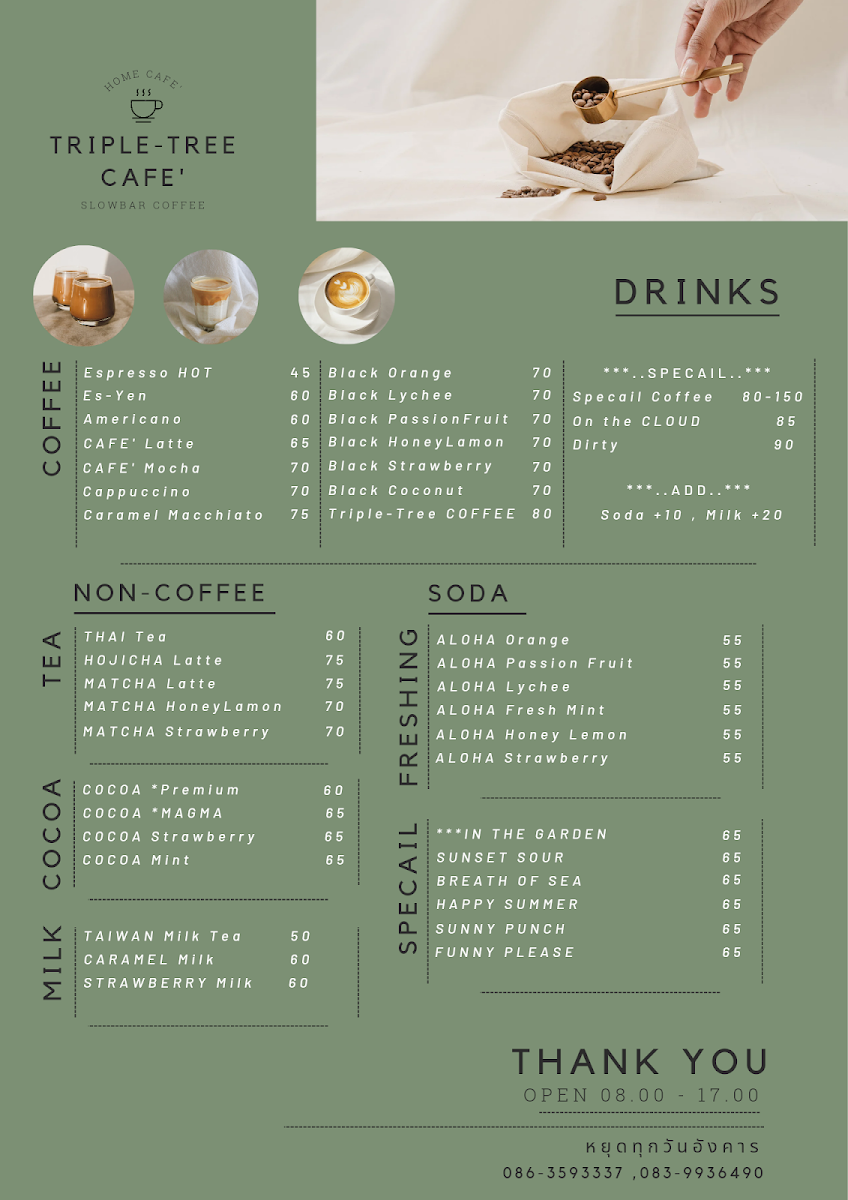 Welcome to Triple-Tree CAFE', a delightful gem nestled in the heart of Nakhon Pathom. This charming café offers an inviting atmosphere with lush greenery and a cozy setting, making it perfect for casual meet-ups or focused work sessions. The menu boasts a diverse selection of beverages and desserts that are sure to tantalize your taste buds.